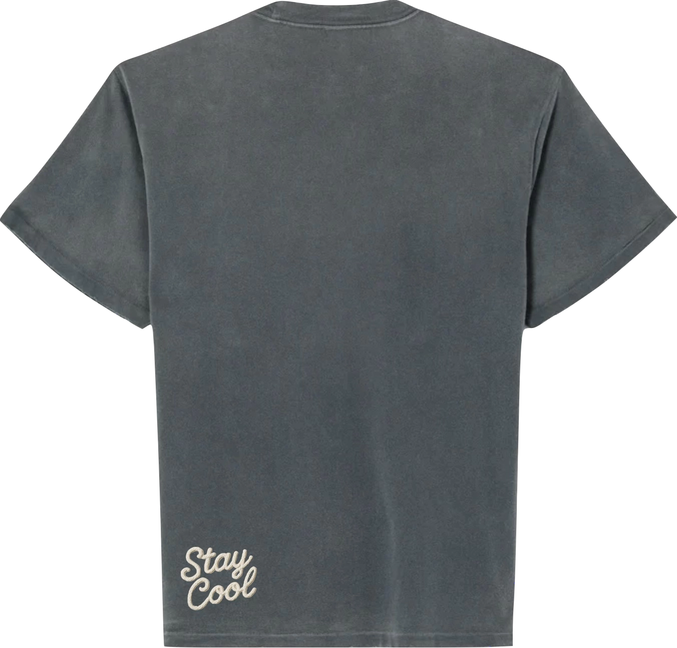 The charcoal sun-fade wash mirrors the exact moment the desert shifts from color to shadow. The chain-stitched "Dry Heat" and "Stay Cool" embroidery on the chest and back hem are a quiet nod to the humor and necessity of surviving desert climates: the reminder that even in the harshest places, there is room for play, style, and self-expression. The threadwork is raised, tactile, and created to age like stone — softening along the edges, settling into the cotton with time.
