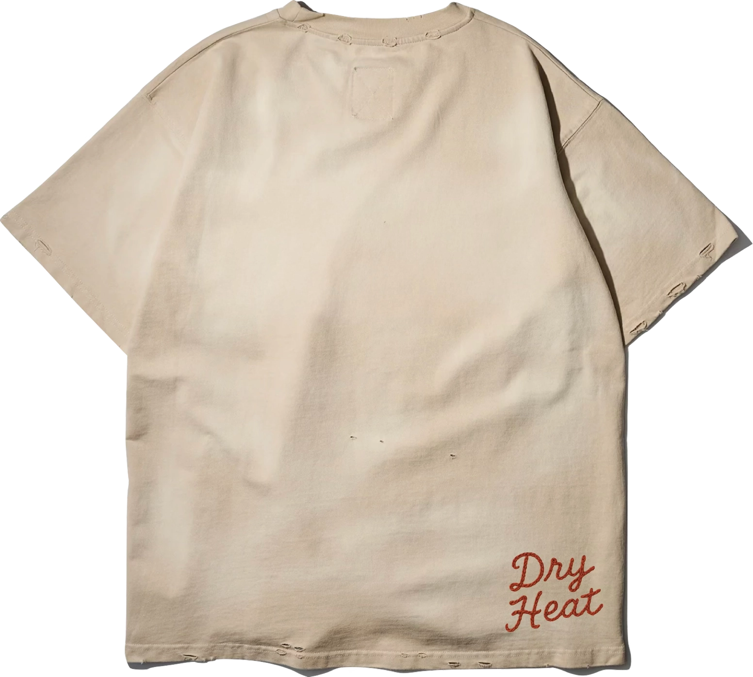 The garment itself follows the lineage of vintage American tees — the kind you find in old trunks or thrift stores in desert towns, softened by decades of sun. Made from 100% combed cotton in a feather-light 130gsm, it’s built for heat, wind, and movement. Single-stitch hems recreate the construction of 70s and 80s premium blanks, when garments were made slowly, carefully, and with materials chosen for longevity rather than cost. The Sun-Fade wash ages the tee just enough to feel familiar from the first wear.