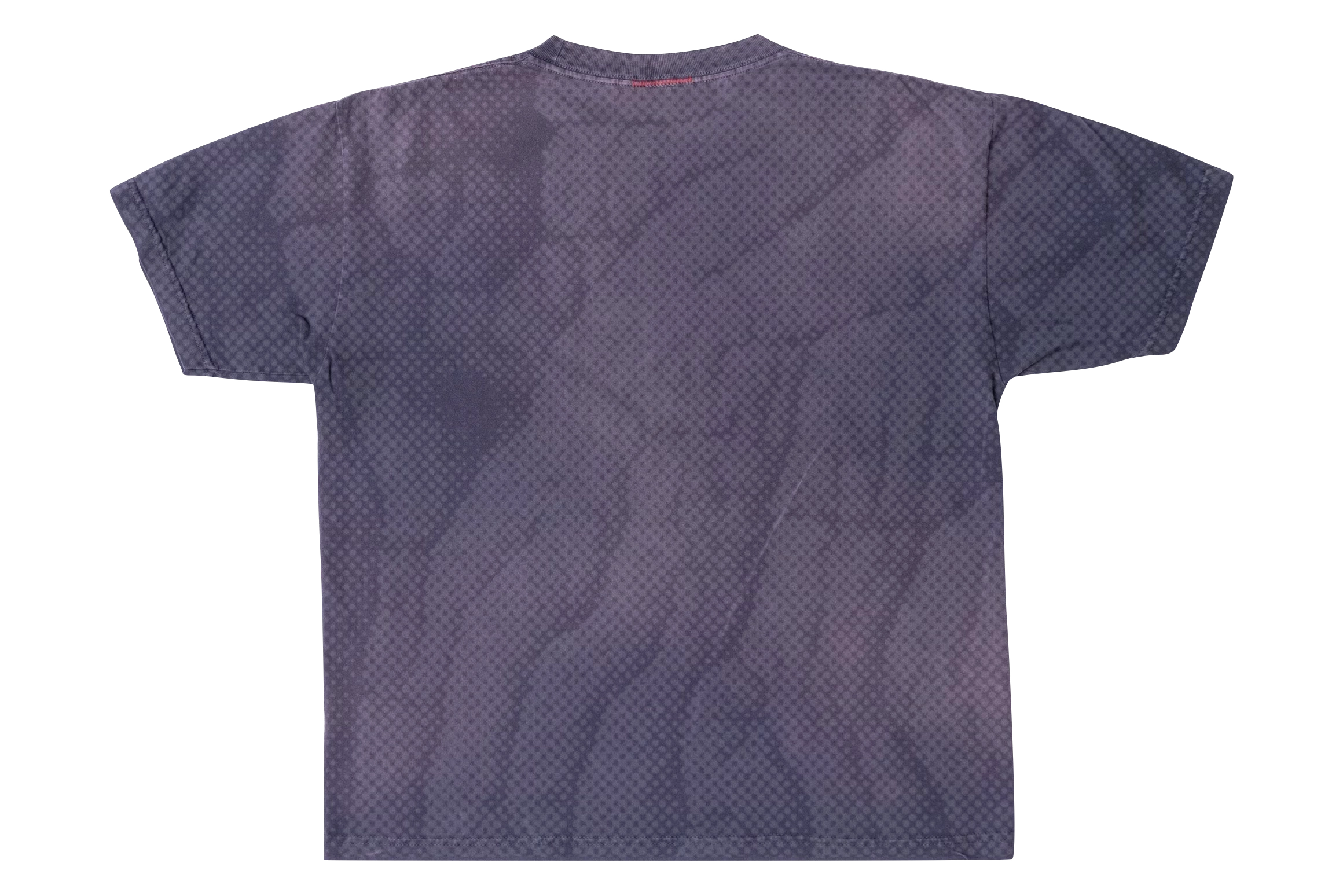 This tee carries that rhythm in its all-over water-based print, a layered shadow pattern that wraps around the garment the way mountain silhouettes wrap around the horizon. Each shape bleeds into the next, fading softly, creating a sense of distance that only deepens the longer you look. It’s not a graphic. It’s a topography.